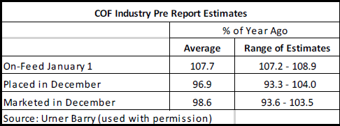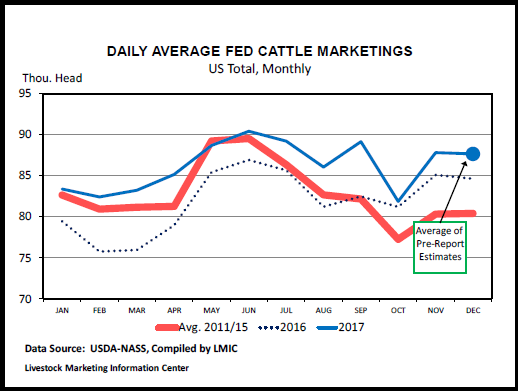 許多分析者預(yù)測(cè)12月份進(jìn)入育肥場(chǎng)的育肥牛數(shù)量同比會(huì)下降。2016年12月的存欄量是自2010年以來(lái)量最大的月份, 最近幾個(gè)月的存欄量也一直很大。 然而,如果在報(bào)告中會(huì)有一個(gè)出乎預(yù)料的數(shù)據(jù)的話,應(yīng)該是存欄量會(huì)高于報(bào)告前預(yù)測(cè)的平均水平(只有前一年的96.9%)如果12月的存欄量符合報(bào)告前預(yù)測(cè)的平均值,在2017年第四季度(10月-12月)進(jìn)入育肥場(chǎng)的??倲?shù)同比增幅7.5%(433,000頭),是2012年以來(lái)同期最大量。