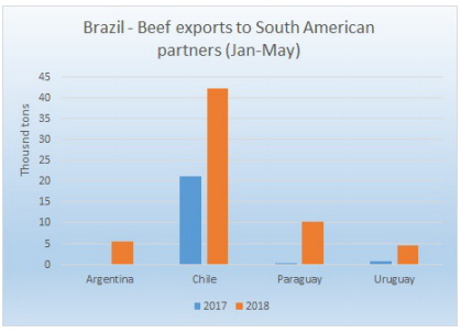 由于亞雷爾兌美元貶值嚴重,巴西牛價大幅下滑,使得2018年對南美其他國家出口量增長兩倍,一到五月總共對智利,阿根廷,巴拉圭和烏拉圭出口62400噸牛肉,其中冷凍牛肉增幅比冷鮮要高,但是平均牛價與去年同期相比從4343美金降低到3711美金。南美主要牛肉進口國智利從巴西進口了42300噸牛肉,比去年同期增長一倍,主要是巴西牛價低以及巴拉圭某些工廠關(guān)閉導(dǎo)致。預(yù)期今年巴西對南美地區(qū)出口會一直保持在高水平。
