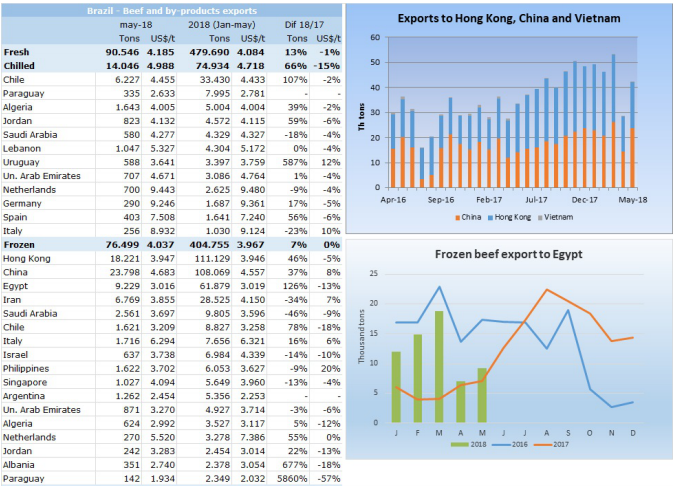 巴西對中國牛肉直接出口量超過了去香港的量,達到了23798噸,香港為18221噸,主要是近期從香港到中國運輸很困難,不過一到五月出口香港的牛肉還是最多,達到了111129噸,然后是出口中國108069噸。中國香港和越南五月一共買了42162噸,比四月份28619噸增加了47%,比去年五月增加25%。第三大出口國是埃及,五月共買了9229噸,雖然比四月多了7000噸,還是遠低于第一季度平均水平。
