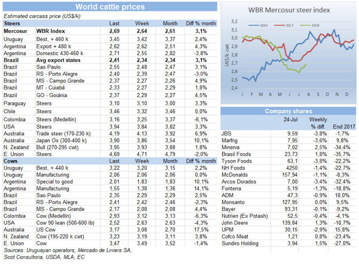 本周各國貨幣尤其是巴西雷亞爾增值,使閹牛價格上漲,南方共同市場閹牛指數(shù)上漲5美分到2.69美金。巴西雷亞爾對美金增值2.5%,部分原因是總統(tǒng)候選人Geraldo Alckmin受歡迎度很高,10月大選前景比較被看好,而且本地牛價也增加了0.3雷亞爾/公斤,綜合起來育肥牛價格漲了7美分到2.41美金,9周以來最高。烏拉圭閹牛價格由于供應緊缺也漲了,阿根廷牛價穩(wěn)定,貨幣也穩(wěn)定,連續(xù)四周價格不變,巴拉圭由于處于口蹄疫接種時期,市場比較平靜,牛價保持不變。
