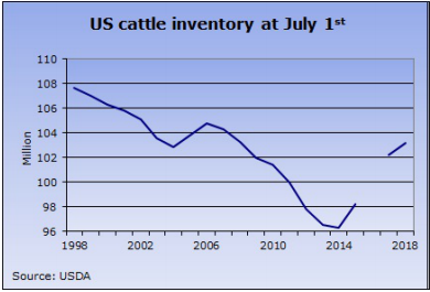 7月日美國所有的活牛和小牛存欄1.03億頭,比去年同期高1%,數(shù)據(jù)預示牧場數(shù)量增加接近尾聲,但活牛總量未來幾年還會緩慢攀升,近幾年牛肉產(chǎn)量還是會持續(xù)增加,對育肥牛和存欄牛價格施壓。母牛和小母??偣?span>4190萬頭,比去年同期高1%,肉母牛3250萬頭,奶母牛940萬頭。小牛犢3650萬頭,同比增加2%,上半年出生2660萬頭小牛,同比增加2%,下半年預計還會出生990萬頭小牛。