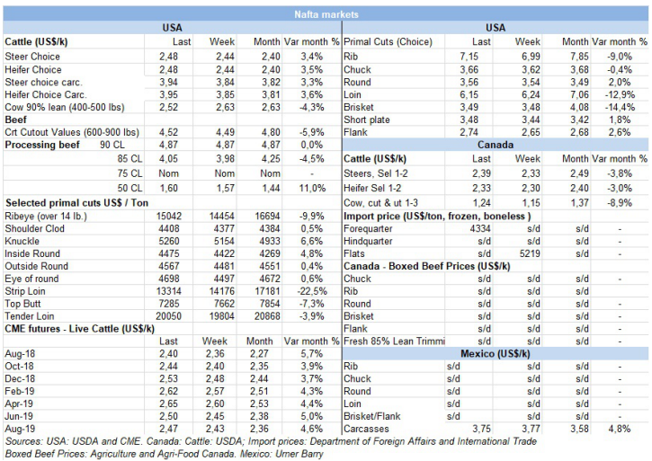 在六月份價格大漲之后,最好的英國種閹牛價格七月以來保持穩(wěn)定,70-73比索/公斤,印度串種牛與上周價格相同,68-70比索,超過580公斤的霍爾斯坦公牛61-63比索,只有良種和特種母牛漲了1比索,達到56-58比索/公斤。