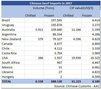 2017年巴西和烏拉圭是中國的牛肉主要供應國