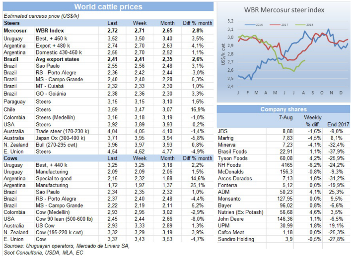 阿根廷閹牛價(jià)格再度上漲,自五月初以來(lái)阿根廷比索結(jié)算價(jià)增加了18%,美金價(jià)格也從去年十一月最低的2.43漲到2.74美金,漲幅13%,本周貨幣保持穩(wěn)定,本地牛價(jià)上漲使美金價(jià)格增加了4美分。烏拉圭牛價(jià)穩(wěn)中有升,本周3.52美金,近三年最高。巴西本地牛價(jià)有所上漲,但美金價(jià)穩(wěn)定在2.41美金,巴拉圭牛價(jià)也保持不變。本周南方共同市場(chǎng)閹牛指數(shù)漲了1美分至2.72美金。