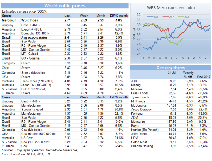 南方共同市場閹牛指數(shù)本周漲了2美分到2.71美金,12周以來最高,本周阿根廷,烏拉圭和巴拉圭牛價都上漲,巴西保持不變。阿根廷近期牛價又開始強(qiáng)勁上漲,本周漲了2比索,換算成美金價漲了8美分至2.7美金,比6月中最低的2.43美金高了很多,巴拉圭和烏拉圭供應(yīng)短缺也促使牛價上漲。巴西本地牛價微漲,但被貨幣的小幅貶值抵消了。