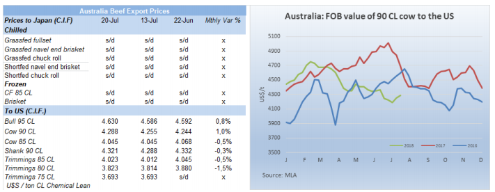 中國市場沒有活躍的跡象,不確定這一過程會持續(xù)多久,中國進(jìn)口商想還跟匯率上漲之前一樣的人民幣價格,把匯率上漲的成本轉(zhuǎn)嫁給出口商,因此還價折換成美金非常低,很難成交。比如全牛前報盤3100,還盤2900,90機(jī)測牛前報3900,還3550。美金人民幣匯率從展會時的6.3漲到現(xiàn)在的6.9,意味著成本上升了15%,八月對今年的市場發(fā)展趨勢非常關(guān)鍵。此外水漂貨走量和價格也很疲軟,巴西腱子甚至不超過3600。