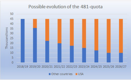 美國(guó)與歐盟已經(jīng)就481配額達(dá)成協(xié)議,歐盟初步給美國(guó)1.85萬噸的獨(dú)家配額,六年半之后逐步增加到3.5萬噸。481配額總共4.5萬噸,分四個(gè)季度,每季度1.125萬噸,由美國(guó)、烏拉圭、阿根廷、澳洲、新西蘭和加拿大分配。協(xié)議生效后,原有國(guó)家配額將在2020年上半年先減少9250噸,然后每年減少2500噸,直至2025/26年減少到只剩1萬噸。近幾年烏拉圭和澳洲每年各用掉1.6萬噸481配額,他們的配額將會(huì)大幅減少,阿根廷481配額增長(zhǎng)也很迅速,去年達(dá)到6800噸,也會(huì)受到配額減少的影響。