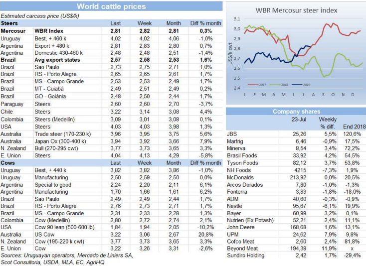本周南方共同市場(chǎng)閹牛價(jià)格又跌了1美分到2.81美金/公斤,原因主要是巴西本地牛價(jià)的下跌,本周跌了0.6雷亞爾/15公斤,阿根廷比索也繼續(xù)貶值,使阿根廷美金牛價(jià)跌了2美分到2.81美金。