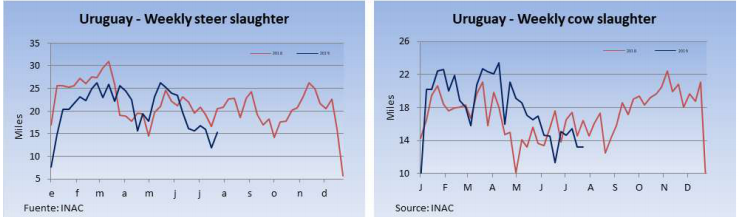 雖然需求端減產(chǎn)試圖壓低采購(gòu)價(jià),烏拉圭育肥牛價(jià)格還是保持穩(wěn)定,上周供應(yīng)非常稀缺,工廠把所有能采到的牛都屠宰了,冷空氣加劇使得飼育場(chǎng)育肥困難,預(yù)計(jì)八月中開(kāi)始育肥牛尤其是481配額的閹牛供應(yīng)會(huì)增加,目前閹牛價(jià)格4-4.05美金/公斤,育肥母牛3.8-3.85美金,小母牛3.9-3.95美金。
