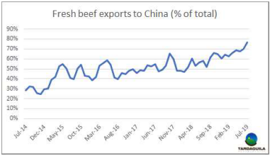 中食展期間的高需求量以及價格反映在了烏拉圭過去兩月的出口價格上,前四個月出口均價換算為胴體重量為3727美金/噸,而六七月均價達(dá)到4110美金,增長10%。另外中國市場進(jìn)口量占牛肉產(chǎn)量比例增長,前四個月占比52%,而六七月是59%。