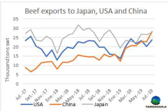 烏拉圭七月牛肉出口量降到2017年十月來最低水平,僅22699噸,其中冷凍牛肉20926噸,中國市場占比越來越高,共進(jìn)口17443噸,占冷凍牛肉83%,占總出口量77%,中國市場進(jìn)口總值占比也在增加。前七個月出口中國總量增長30%,均價上漲10%,今年均價4730美金/噸,還在繼續(xù)上漲,七月均價達(dá)到了5147美金,其中帶骨牛肉均價3427美金/噸,同比上漲12%。