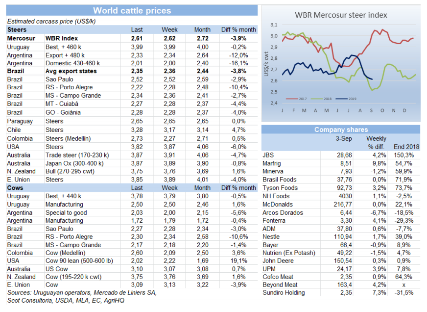 中美貿易戰(zhàn)的影響還在持續(xù),但本周初中國市場保持堅挺。烏拉圭統(tǒng)牛無骨件套+帶骨肋排分開銷售可以保證整個牛的銷售,快速提升營業(yè)額,省下需求最大的牛骨和牛副。中國進口增長受水漂市場影響,巴西出口香港前后腱3350美元/噸,牛副價格更好,價格與5月食品展時期相似。非洲豬瘟導致臺灣需求增長,巴拉圭也從中獲益,前后腱4900美元/噸,牛霖4600美元/噸。