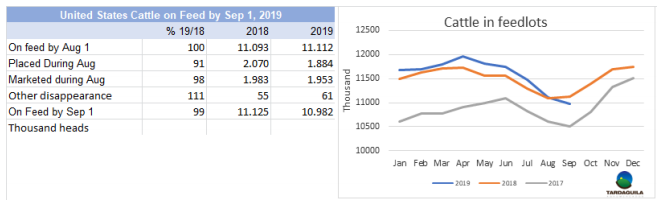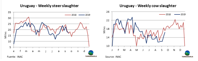 (3998頭),Las Piedras (3644頭),NH-BPU(3637)。Marfrig三家工廠共屠宰9519頭,Minerva兩廠共屠宰7513頭。9月截止目前,共屠宰122334頭牛,比去年同期減少7.3%,預(yù)計本月屠宰量將近17萬頭,比2018年9月減少1萬頭,年屠宰量的差距將縮小,過去三個月屠宰量減少1.9萬-2.9萬頭。