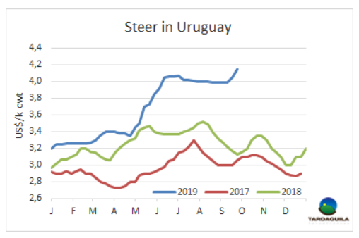 本周南方市場(chǎng)閹牛胴體價(jià)格增長(zhǎng)2美分,增至2.67美元/公斤。價(jià)格的回漲是因?yàn)榘臀骱蜑趵绱着r(jià)格堅(jiān)挺。本周在巴西主要的出口州,育成閹牛均價(jià)增長(zhǎng)1.5雷亞爾/15公斤,增長(zhǎng)至151.8美元/15公斤,雷亞爾價(jià)值穩(wěn)定。美元價(jià)格增長(zhǎng)3美分,增長(zhǎng)至2.43美元/公斤。烏拉圭供應(yīng)短缺再次沖擊市場(chǎng),閹牛胴體價(jià)格在4.15美元/公斤左右。阿根廷閹牛出口價(jià)格按當(dāng)?shù)刎泿庞?jì)穩(wěn)定適中,按美元計(jì)價(jià)格下跌6美分,跌至2.23美元/公斤,是整個(gè)南方共同市場(chǎng)最低價(jià)。巴拉圭待宰閹牛胴體價(jià)格仍穩(wěn)定在2.65美元/公斤。
