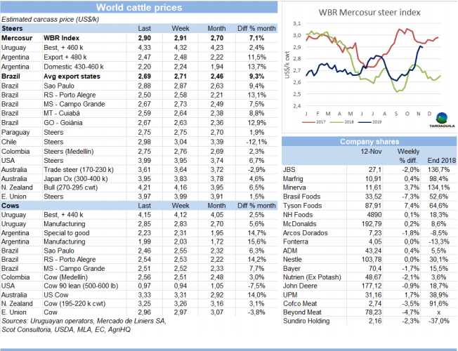 巴西育成牛按雷亞爾計(jì)算堅(jiān)挺,但雷亞爾貶值的影響超過(guò)價(jià)格本身,因此受雷亞爾貶值將近5%的影響,南方市場(chǎng)閹牛價(jià)格指數(shù)本周下跌1美分,胴體價(jià)格跌至2.9美元/公斤。巴西老公牛價(jià)格按雷亞爾計(jì)算上漲3.9%,但雷亞爾貶值帶來(lái)的影響更大,在主要的出口州老公牛平均價(jià)格下跌2美分,下跌至2.69美元/公斤。南共市的其他國(guó)家價(jià)格變化不大,烏拉圭價(jià)格仍然穩(wěn)定,遠(yuǎn)比其他國(guó)家參考價(jià)格高,胴體價(jià)格4.33美元/公斤。阿根廷胴體價(jià)格2.47美元/公斤。