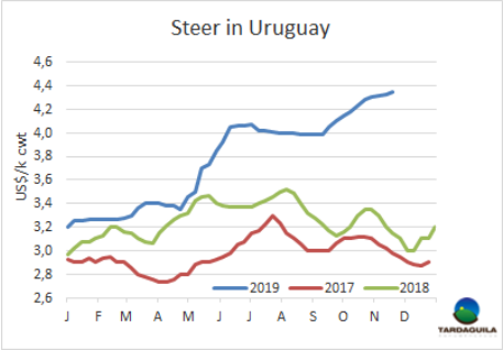受巴西價(jià)格強(qiáng)勢(shì)增長(zhǎng)影響,南方共同市場(chǎng)閹牛平均價(jià)格強(qiáng)勢(shì)增長(zhǎng),南方市場(chǎng)閹牛價(jià)格指數(shù)本周上漲20美分,上漲至至3.1美元/公斤,達(dá)到自2016年10月三年多以來(lái)最高水平。巴西直接出口中國(guó)的工廠增加,需求端對(duì)相對(duì)短缺的供應(yīng)端做出反應(yīng),本周價(jià)格按雷亞爾計(jì)算增長(zhǎng)了13%,按美元計(jì)算增長(zhǎng)了12.4%,主要的出口州老公牛平均胴體價(jià)格3.03美元/公斤,一周內(nèi)增長(zhǎng)了34美分。阿根廷情況則不同,出口閹牛價(jià)格仍然保持10月末的水平,歐洲需求的減少對(duì)價(jià)格有一定影響。巴拉圭市場(chǎng)更加穩(wěn)定,胴體價(jià)格2.8美元/公斤,達(dá)到3月初至今最高。烏拉圭特種閹牛價(jià)格達(dá)歷史最高,胴體價(jià)格4.35美元/公斤,在接下來(lái)的幾天價(jià)格會(huì)趨于平緩。
