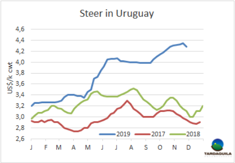 巴西育成牛價(jià)格上漲趨勢(shì)沒(méi)有停止,再次影響南方共同市場(chǎng)閹牛價(jià)格,本周南方市場(chǎng)閹牛價(jià)格上漲13美分,上漲至3.23美元/公斤,達(dá)到2015年5月至今四年半以來(lái)最高。盡管本周巴西雷亞爾匯率下跌1.6%,主要出口周胴體平均價(jià)格上漲13美分,上漲至3.26美元/公斤。阿根廷和巴拉圭本周價(jià)格并沒(méi)有太大波動(dòng),烏拉圭價(jià)格下跌7美分。