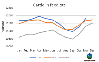 據(jù)美國(guó)農(nóng)業(yè)部統(tǒng)計(jì),11月1日,存欄能力1000頭以上的養(yǎng)牛場(chǎng)存欄總量1183.1萬(wàn)頭,比去年增長(zhǎng)1.2%。10月大量補(bǔ)欄和市場(chǎng)低迷使牛只存欄大幅增加。9月和10月的銷(xiāo)售降低導(dǎo)致前端供給增長(zhǎng)。10月飼育場(chǎng)187.5萬(wàn)頭牛只出欄,比一年前減少0.6%,11月根據(jù)屠宰情況推測(cè)預(yù)計(jì)減少0.4%。