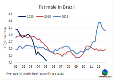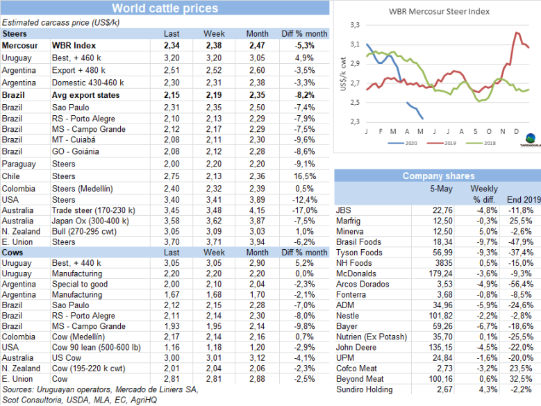 自疫情開始襲擊南美地區(qū)以來,南方共同市場(chǎng)閹牛平均價(jià)格保持下行趨勢(shì)。本周閹牛價(jià)格2.34美元/公斤,較上周下跌4美分,較2月末下跌64美分,下跌了21.5%。本周巴西貨幣貶值仍然是主導(dǎo)因素,疫情對(duì)巴西政治和公共衛(wèi)生方面的影響導(dǎo)致其貨幣再次貶值1.5%,較2月末貶值27.4%。巴拉圭活牛價(jià)格下跌也拉低了該地區(qū)閹牛價(jià)格指數(shù),巴拉圭待宰活牛價(jià)格本周下跌20美分,下跌至2美元/公斤。阿根廷和烏拉圭本周參考價(jià)格保持穩(wěn)定。