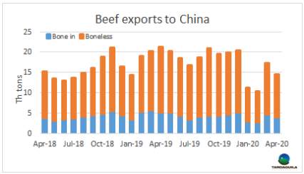 由于歐洲需求銳減,日本成為烏拉圭4月份出口冷凍牛肉的主要目的地。4月烏拉圭至日本牛肉出口量14.7噸,平均出口離岸價(jià)9203美元/噸。日本成為最大出口目的地不是由于到日本出口量上漲,而是由于到其他市場(chǎng)出口量下降,主要是歐洲。2019年10月至2020年1月期間,冰鮮牛肉至日本平均發(fā)船量200噸/月,2020年2月至4月,縮減至150噸/月。