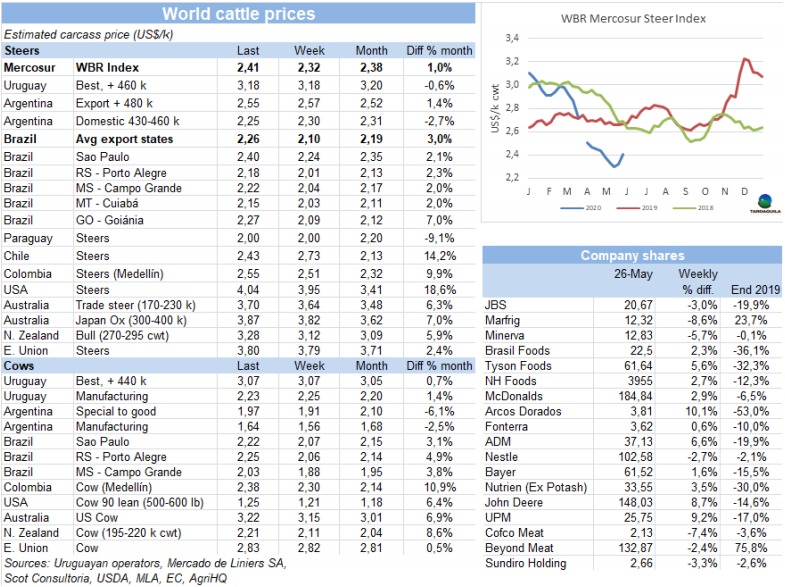 本周南方共同市場閹牛價(jià)格上漲了9美分,上漲至2.41美元/公斤。主要由于雷亞爾升值6.7%。全球經(jīng)濟(jì)環(huán)境好轉(zhuǎn),美國采取了一些措施放寬了對(duì)疫情的防控限制,加上巴西國內(nèi)政治環(huán)境利好,刺激了巴西貨幣增值。昨天美元對(duì)雷亞爾匯率下調(diào)至5.34,較兩周之前的5.8下調(diào)很多,今年巴西貨幣在市場上顯出的極端波動(dòng)性仍然持續(xù)。巴西的主要出口州育成牛平均價(jià)格上漲了16美分,上漲至2.26美元/公斤。其他地區(qū)牛價(jià)保持不變。巴西育成牛價(jià)格上漲0.3雷亞爾/15公斤,上漲至181.2雷亞爾/15公斤。本周南方共同市場其他三個(gè)國家參考價(jià)格保持穩(wěn)定。