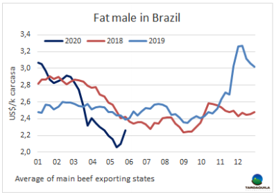 為降低新冠疫情在最嚴(yán)重的圣保羅州的傳播風(fēng)險(xiǎn),州政府決定下周放假三天,推行從周四至周一的長周末并控制人員流動(dòng)。批發(fā)市場需求減少,工廠延期活牛的預(yù)定,行情產(chǎn)生了不確定性。圣保羅和馬托格羅索期貨時(shí)間延長至九天。圣保羅主要畜牧產(chǎn)區(qū)育成牛由于供應(yīng)短缺價(jià)格保持相對(duì)穩(wěn)定,活牛參考價(jià)保持192雷亞爾/15公斤。批發(fā)市場值得注意的是前部位肉價(jià)格,前部位肉價(jià)格降幅與后部位肉價(jià)格降幅的差值達(dá)歷史最低水平,只有16%。而與豬肉和家禽相比,價(jià)格溢價(jià)達(dá)到歷史最高水平。與豬肉的價(jià)差是歷史平均水平(18%)的5倍多,而家禽的差異是歷史平均水平(86%)的2.4倍。原因有兩方面,一方面國內(nèi)市場經(jīng)濟(jì)困難使后部位肉價(jià)格平穩(wěn),另一方面,中國市場需求有利于前部位肉價(jià)格穩(wěn)定。