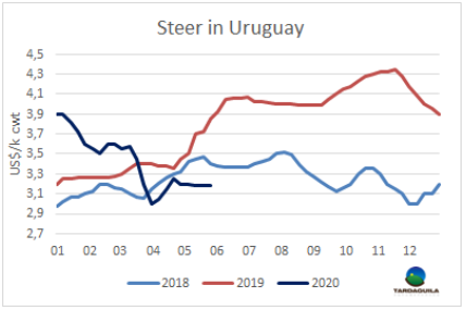 在公布四月的閹牛類型價(jià)值數(shù)據(jù)時(shí),烏拉圭肉協(xié)做了一些澄清,強(qiáng)調(diào)“在當(dāng)前條件下,平均工廠增值價(jià)值無法覆蓋工廠成本”。4月閹牛類型價(jià)值每頭較3月下跌了85美元,下跌至1162美元,達(dá)2019年5月以來最低。2019年5月中國進(jìn)口價(jià)格開始飆升。牛只的平均采購價(jià)格急劇下降,每頭降了120美元,降至835美元。因此,每頭牛的增值價(jià)值(兩者之間的差額,即工廠必須支付的其他成本,并最終獲得的收益)增加了35美元,至327美元,這是自2017年12月以來的最高水平。烏拉圭肉協(xié)提醒,閹牛類型價(jià)值只反應(yīng)“計(jì)算時(shí)可用的統(tǒng)計(jì)數(shù)據(jù),不包括一些出口合同中額外的變化?!边@里是歐洲進(jìn)口商與一些工廠就3月成交的481配額合同議價(jià)的情況。此外,烏拉圭肉協(xié)還稱,屠宰活動(dòng)極少時(shí)銷售額同樣不足以支撐成本。閹牛類型價(jià)值的降低是由于出口部位肉、牛雜碎、牛副、鮮皮等價(jià)格下跌,國內(nèi)市場胴體價(jià)格大體保持不變(所有價(jià)格按美元計(jì))閹牛類型價(jià)值是對(duì)480公斤活重出成率54%的英國純種閹?;蚱潆s交品種所產(chǎn)出的所有產(chǎn)品的平均價(jià)值總和的估算。
