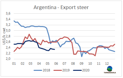 閹牛出口價(jià)格保持前兩周的水平,最好的英國純種閹牛保持155-160比索/公斤,印度串種閹牛保持150-155比索/公斤,特優(yōu)種母牛138-142比索/公斤,工業(yè)母牛下跌1比索至119-129比索/公斤。
