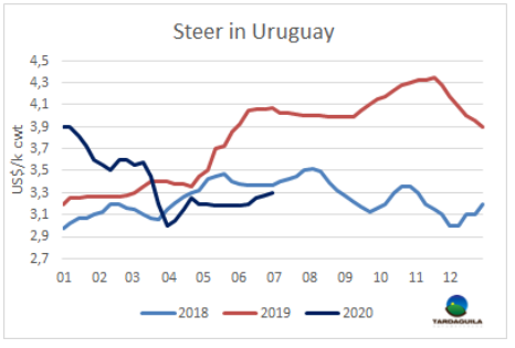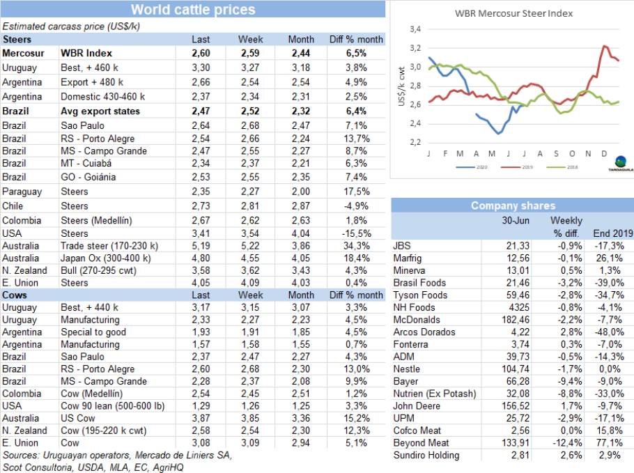 本周南方共同市場(chǎng)閹牛平均價(jià)格覆蓋了巴西貨幣疲軟帶來(lái)的價(jià)格下行。受疫情擴(kuò)散帶來(lái)的擔(dān)憂(yōu)影響,巴西貨幣兌美元匯率下跌6.1%。盡管巴西育成牛平均價(jià)格上漲8雷亞爾/15公斤,上漲至202.8雷亞爾/15公斤,其美元價(jià)格下跌了5美分,下跌至2.47美元/公斤。南美地區(qū)其他國(guó)家育成牛價(jià)格均上行,尤其在阿根廷,活牛供應(yīng)短缺以及冰鮮產(chǎn)品到歐洲的出口價(jià)格拉動(dòng)出口閹牛價(jià)格上漲10比索/公斤。美元價(jià)格達(dá)到2.35美元/公斤。烏拉圭方面供應(yīng)短缺導(dǎo)致活牛參考價(jià)上漲3美分,上漲至3.3美元/公斤。WBR南方市場(chǎng)閹牛價(jià)格指數(shù)上漲1美分,至2.6美元/公斤。