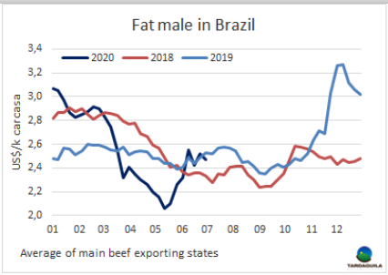 上周巴西主要牛產(chǎn)區(qū)育成牛價(jià)格強(qiáng)勁上漲,圣保羅州上周五活牛價(jià)格指數(shù)達(dá)218.35雷亞爾/15公斤,較前一周成交價(jià)上漲8雷亞爾/15公斤。本周價(jià)格增長(zhǎng)最明顯的地區(qū)戈亞尼亞(上漲10雷亞爾至207雷亞爾/15公斤),圣保羅(上漲了9.5雷亞爾,上漲至216.5雷亞爾/15公斤)30天內(nèi)付款。圣保羅做出口業(yè)務(wù)的工廠(chǎng)出價(jià)高達(dá)220雷亞爾/15公斤。那些做國(guó)內(nèi)屠宰的工廠(chǎng)出價(jià)低5-10雷亞爾/15公斤。供需雙方都比較樂(lè)觀(guān),由于價(jià)格預(yù)計(jì)將繼續(xù)上漲,牛只供應(yīng)不足,牧草條件依然良好,生產(chǎn)者可以壓欄,價(jià)格預(yù)期繼續(xù)上漲。期貨預(yù)訂時(shí)間很短,從4天到5天不等。從需求端看,庫(kù)存很低,而且接近月初,人們預(yù)計(jì)銷(xiāo)售情況會(huì)好轉(zhuǎn)。此外,7月6日起圣保羅酒吧和餐館的可能重新開(kāi)放,也為市場(chǎng)帶來(lái)積極的氣氛。