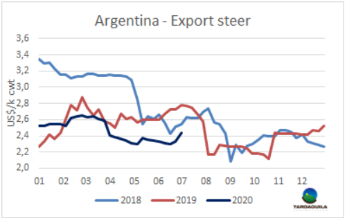 正如WBR預(yù)測(cè),猶太屠宰的重新開(kāi)始,加上歐洲需求的改善,加劇了牛只短缺,導(dǎo)致活牛價(jià)格大幅上漲,每公斤上漲10比索。最好的英國(guó)純種閹牛成交價(jià)168-173比索/公斤,印度串種閹牛163-170比索/公斤,特優(yōu)種母牛價(jià)格上漲了1-2比索,上漲到142-146比索/公斤,工業(yè)母牛價(jià)格不變,120-125比索/公斤。