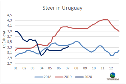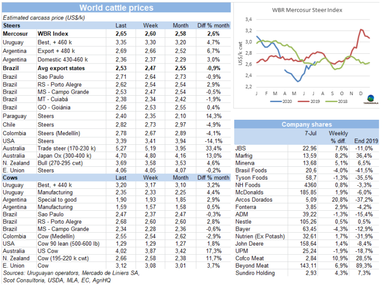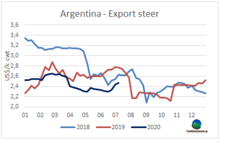 一位貿(mào)易商總結,“現(xiàn)在市場有所好轉”。部分原因是中國市場開始回暖,尤其是一些部位肉的價格有所上漲,盡管他強調(diào)仍存在一些投機的貿(mào)易。未來我們將看到價格是否可以保持,是上漲一些還是回到一周之前的水平。中國市場很亂,有客戶考慮到目前的狀況仍想出低價,而另一些人認為后面幾個月會漲價已經(jīng)以高一些的價格確認。牛肉價格上漲受到豬價上漲的拉動,其他肉類也是如此。中國白條價格連續(xù)7周上漲至3.4美元/公斤,較五月下旬低點上漲了35%。一位貿(mào)易商強調(diào),烏拉圭對疫情的控制相對較好,對進口商來講比較穩(wěn)定,與阿根廷和巴西正在經(jīng)歷的情況大相徑庭,對于要提前付預付的進口商來說非常重要。阿根廷統(tǒng)牛六切報價范圍在3950-4100較上周上漲了200-300美元/噸。巴西工廠也表示中國市場有所好轉,香港漂貨市場前后腱成交價4000美元/噸,從上周開始出口市場更活躍了。一位出口商強調(diào),收到的牛副還價很低,都是一些不可能成交的價格。