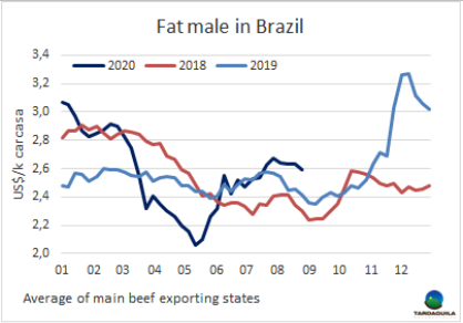 八月巴西牛肉出口量較20-19年增長(zhǎng)了10%