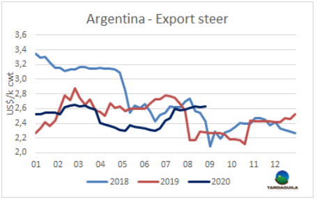 下周猶太屠宰季即將結(jié)束。猶太屠宰季始于6月,在阿根廷外交部和以色列大使館的共同努力下,牛肉加工機(jī)構(gòu)設(shè)法將猶太潔食的工作人員從以色列包機(jī)帶回。屠宰隊(duì)將在猶太新年結(jié)束工作,目前還不清楚他們什么時(shí)候能回來。因此,牛犢的貿(mào)易在一個(gè)月到一個(gè)半月之內(nèi)將退出游戲。這使工廠面臨的情況更加復(fù)雜,閹牛價(jià)格上漲,國(guó)內(nèi)市場(chǎng)低迷,希爾頓配額價(jià)格由于新冠疫情的再次出現(xiàn)和需求的疲軟而下跌,美國(guó)配額用盡,中國(guó)市場(chǎng)僅有貨值低的部位需求且價(jià)格上漲緩慢。