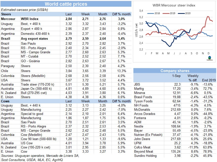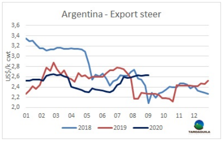 本周受巴西和巴拉圭方面牛價強勁拉動,南方共同市場閹牛價格指數(shù)較上周上漲了13美分,上漲至2.84美元/公斤。巴西待宰牛雷亞爾價格上漲,主要出口州育成牛均價上漲了3.2%,上漲至225.8雷亞爾/15公斤,本周雷亞爾增值3.9%,美元參考價上漲了20美分,上漲至2.79美元/公斤。巴拉圭活牛供應(yīng)減少,育成牛價格也上漲了20美分,上漲至2.5美元/公斤。阿根廷和烏拉圭出口閹牛價格保持穩(wěn)定。