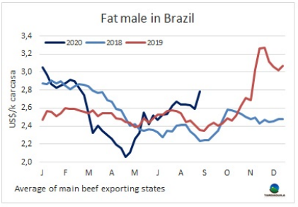 8月巴西牛犢的平均價格同比上漲了約56%,漲幅高于育成牛的價格漲幅。全年補欄率大幅上升。犢平均體重180公斤的8個月斷奶的牛,報價每公斤11.1雷亞爾,比2019年8月的平均價格7.11雷亞爾/公斤高出56%?!蓖粫r期,主要出口州,育成牛價格增長了47%,從146.2雷亞爾/15公斤增長到214.7雷亞爾/15公斤。補欄率增加到1.49,鼓勵育種者在繁殖群中保留母牛,母牛的屠宰供應(yīng)減少。