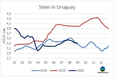 八月烏拉圭牛肉出口量下降,主要由于對中國出口量下降。把月烏拉圭對中國出口牛肉11787噸,較七月出口量減少了1525噸,同比去年下降了近6900噸。2020年1-8月,烏拉圭對中國牛肉出口總量101660噸,較去年減少了47500噸(減少了32%),達(dá)2016年以來同期最低。8月牛肉出口總量達(dá)22748噸,平均離岸價為5417美元/噸。與7月相比,出口量減少了2200噸,而平均價格上漲了9%,原因是冰鮮牛肉的比例增加了,而且中國的冷凍牛肉價格提高了100美元/噸。八月第二大出口目的國是美國,烏拉圭對美國牛肉出口量2426噸,其次是俄羅斯(820噸)和以色列(792噸)。