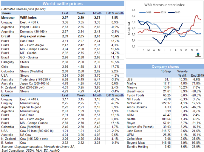 中國(guó)市場(chǎng)有需求,盡管一些進(jìn)口商的采購(gòu)仍然很謹(jǐn)慎,聲稱市場(chǎng)上現(xiàn)貨庫(kù)存仍然很大。然而接受采訪的市場(chǎng)參與者均表示整體趨勢(shì)更加樂(lè)觀了。一些中國(guó)進(jìn)口商已經(jīng)開(kāi)始為下一個(gè)春節(jié)做準(zhǔn)備,船期必須要保證在10月至12月之間。巴西出口商稱中國(guó)主港和香港的需求都更加強(qiáng)勁了,香港前后腱成交價(jià)4600美元/噸,價(jià)格還有可能成交到更高的水平。水漂市場(chǎng)牛副價(jià)格和需求都有所上漲。一位業(yè)內(nèi)人士稱收到中國(guó)方面對(duì)牛前的還價(jià)4800美元/噸,但活牛價(jià)格非常高,即使價(jià)格在這一水平,也很難成交。另一方面烏拉圭羊肉的需求旺盛,但成交仍需謹(jǐn)慎,因?yàn)榛钛驍?shù)量不足,很可能讓價(jià)格停止上漲。同時(shí)巴拉圭出口商強(qiáng)調(diào)近幾個(gè)月臺(tái)灣方面的進(jìn)口價(jià)格和需求水平都更穩(wěn)定了,前后腱成交價(jià)范圍在3500-3800美元/噸,肩胛背肩成交價(jià)3500-3600美元/噸,也有一些后部位肉和牛柳賣(mài)到臺(tái)灣市場(chǎng)。