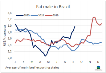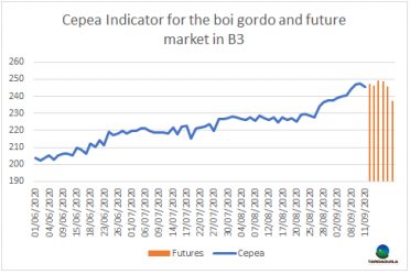 巴西主要出口州育成牛平均價(jià)格自六月初價(jià)格開(kāi)始上漲以來(lái)上漲了30%。受供應(yīng)短缺和出口需求尤其是中國(guó)市場(chǎng)需求強(qiáng)勁的影響,與去年九月中相比,上漲接近60%。本周巴西主要出口州育成牛價(jià)格上漲至237雷亞爾/15公斤,30天付款,免運(yùn)費(fèi)。期貨市場(chǎng)參考價(jià)Cepea育成牛價(jià)格指數(shù)為245.65雷亞爾/15公斤。較本周中間幾天247雷亞爾/15公斤的最高價(jià)有輕微下降。略低的價(jià)格影響育成牛期貨價(jià)格輕微下行。預(yù)計(jì)當(dāng)前的價(jià)格將保持堅(jiān)挺,因?yàn)槭袌?chǎng)仍是然以供應(yīng)端為主導(dǎo)。但價(jià)格的上行趨勢(shì)將結(jié)束。11月和12月價(jià)格預(yù)計(jì)將達(dá)250雷亞爾/15公斤,到2021年五月價(jià)格將達(dá)237雷亞爾/15公斤。