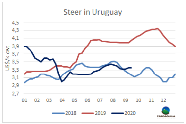 本周南方共同市場(chǎng)閹牛價(jià)格指數(shù)連續(xù)第三周上漲,上漲至2.97美元/公斤。前面三周隨著巴西價(jià)格上漲,南方共同市場(chǎng)閹牛指數(shù)上漲了38美分,上漲了15%。上漲的主要因素仍是巴西,巴西按雷亞爾計(jì)主要出口州育成牛平均價(jià)格上漲了8.4%,上漲至237.1雷亞爾/15公斤,同時(shí)雷亞爾升值了5.9%。巴拉圭是另一個(gè)牛價(jià)上漲的國(guó)家,過(guò)去三周待宰牛價(jià)格上漲了38美分,上漲至2.68美元/公斤。南美地區(qū)最低價(jià)(巴拉圭)和最高價(jià)(烏拉圭)的差距從三周前的1.02美元縮減至目前的0.68美元。阿根廷和烏拉圭牛價(jià)大體穩(wěn)定,參考價(jià)分別在2.83美元/公斤(含9%的出口稅)和3.36美元/公斤。