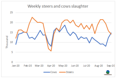 上周母牛屠宰量增長(zhǎng),盡管被閹牛和小母牛屠宰量的下降所抵消,烏拉圭活牛屠宰量仍有輕度上漲。烏拉圭肉協(xié)報(bào)道,截止九月12日的一周內(nèi),牛屠宰量33374頭,較上周上漲了0.5%,增加了167頭,同比去年同一周,屠宰量下降了6520頭,約16%。母牛屠宰量顯著增長(zhǎng),達(dá)14727頭,增長(zhǎng)了18.6%,達(dá)六月第一周以來(lái)最大母牛屠宰量。相反,閹牛屠宰量下降了10.3%,下降至14172頭,小母牛屠宰量4156頭,下降了14.5%。自四月末起20周以來(lái)母牛屠宰量首次超過(guò)閹牛屠宰量。屠宰量最高的工廠是Athena-Pulsa(3680頭)Las Piedras(3524頭)Marfrig-Colonia(3503頭)。Marfrig三家工廠屠宰總量9060頭,美麗華Carrasco廠重新開(kāi)始屠宰,屠宰總量達(dá)6080頭。九月截至目前牛屠宰量60886頭,較去年同期下降了1萬(wàn)頭,下降了14.1%。