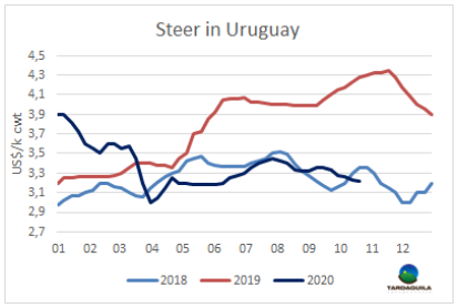 在過去的一年里,由于激進的需求推動牛價上漲,因此,通過在飼養(yǎng)方面的更大投資,加速了動物屠宰速度,待宰閹牛牛齡大幅下降。根據(jù)國家肉類研究所(INAC)的數(shù)據(jù),在截止8月的12個月中,合規(guī)屠宰場活牛屠宰量91.5萬頭。較上個12個月相比(截至2019年8月),大幅下降,減少了12.5萬頭,降幅為12%。但并非所有類別都出現(xiàn)了下降,那6顆齒和滿齒的牛的屠宰量下跌,被2-4顆齒的牛屠宰量增長所抵消。今年截至八月2-4顆齒閹牛屠宰量44.3萬頭,較前12個月增長了10%,6顆齒活牛屠宰量下降了26%,下降至15.5萬頭。滿齒活牛屠宰量下降了35%,下降至22.8萬頭。因此,最低牛齡的類別占屠宰總量的48.4%。造成這一趨勢的原因毫無疑問與補欄和育肥進程中的投資加大有關(guān)。這并不是偶然的,因為這個國家有最大的永久牧場和每年的飼料作物。根據(jù)畜牧部的數(shù)據(jù),共有180萬公頃的天然牧場土地,至少是本世紀(jì)迄今為止最大面積。與此同時,飼養(yǎng)場的投資得以維持。盡管全球屠宰量有所減少,但今年到目前為止,出欄總數(shù)與去年非常相近。絕大多數(shù)是2-4顆齒的牛和小母牛。