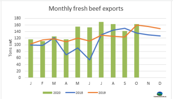 澳大利亞長期的干旱和季節(jié)性條件的改善導致活牛供應緊張,因為生產(chǎn)者繼續(xù)重建牛群。因此,到印度尼西亞出口的體重較小的閹牛價格在2020年達歷史最高,9月的平均價格比去年同期高出13%。由于供應受限和價格高位,出口量遠低于一年前的水平。9月活牛出口量達7.8萬頭,較去年同月回落28%。今年1-9月的出口量較2019年水平回落了12%。MLA的養(yǎng)牛業(yè)預測 10月更新表明,2020年活牛出口預計將下降16%,主要是由于澳大利亞北部供應水平的下降。