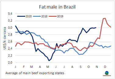 供應短缺、月初的高需求和出口市場的良好表現(xiàn)繼續(xù)支撐巴西主要牛產(chǎn)區(qū)活牛價格上漲。圣保羅方面參考價達270雷亞爾/15公斤。為中國市場準備的小閹牛價格能多賣2雷亞爾/15公斤。批發(fā)市場價格受月初需求拉動也有上漲,十月胴體參考價17.8雷亞爾/公斤,較上月上漲約10%。批發(fā)市場后部位肉緊缺,接下來幾天價格可能再次上漲。