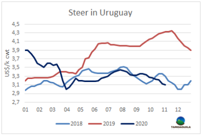 歐洲市場繼續(xù)受到第二波新冠疫情的影響。德國餐館將近四周處于關閉狀態(tài),阿根廷希爾頓臀腰肉的成交價也反映了這一事實。有人提供希爾頓臀腰肉成交價6500-7000美元/噸,因為大多數(shù)工廠只能選擇把這些產(chǎn)品冷凍起來,除此之外別無選擇,只能把庫存賣掉。烏拉圭方面大多數(shù)工廠選擇從目前的貿易中撤退。無論如何,工廠相信,如果在11月剩余時間內病毒的傳播能夠得到控制,12月的需求可能會有所變化。最令人擔憂的問題之一是481配額的谷飼牛的數(shù)量。原則上,歐洲客戶要求的是將生產(chǎn)推遲2-3周。目的是盡可能延長貨物的到港時間,以延長售賣時間,希望疫情可以開始改善。如果把客戶案例逐個分析,首先的想法是盡快裝船,以便貨物可以在一月初清關,利用配額窗口的關稅優(yōu)勢,然后冷凍起來轉賣給進口商。工廠稱最有效的辦法是把活牛留在育肥場,等到下個季度配額開始(4-6月)再進行屠宰。我們有信心歐洲市場將迅速恢復起來,經(jīng)過短暫的封鎖之后市場將在30-40天內恢復正常。