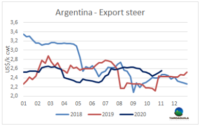 近兩周出口閹牛價格再次上漲,累計上漲了11比索/公斤。最好的英國純種閹牛價格上漲3-5比索,上漲至197-203比索/公斤。印度串種閹牛價格上漲3-7比索,目前價格在190-200美元/公斤波動。特優(yōu)母牛價格再次上漲,上漲了7-10比索/公斤,價格可以達到閹牛種類的最低價,190-195比索/公斤,兩周內價格累計上漲了19比索/公斤。價格上漲最多得是用于到中國市場出口的母牛,工業(yè)母牛價格上漲了8-10比索/公斤,本周成交價在180-188比索/公斤,近三周價格累計上漲28比索/公斤。