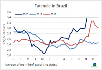 全球經(jīng)濟發(fā)展情況樂觀促使新興國家貨幣大幅升值,南方共同市場閹牛平均價格隨之上漲。輝瑞公司宣布新冠疫苗的有效性高達90%,拜登在美國大選中獲勝,預(yù)期對中國的敵意將被擱置,改善了市場情緒。股市指標(biāo)大幅上升,包括雷亞爾在內(nèi)的新興國家貨幣也大幅上升。本周巴西貨幣兌美元升值6%。巴西待宰牛供應(yīng)仍然十分緊缺,按雷亞爾價格繼續(xù)上漲。貨幣升值和本地牛價上漲拉動主要出口州育成牛價格暴漲36美分,上漲至3.36美元/公斤,達南美地區(qū)牛價最高。圣保羅育成牛價格本周上漲33美分,上漲至3.48美元/公斤。阿根廷和巴拉圭待宰牛價格也有上漲,盡管歐洲市場需求弱,阿根廷出口閹牛價格上漲了8美分,達2.87美元/公斤(包含出口稅),巴拉圭牛價上漲至2.95美元/公斤。南美地區(qū)唯一一個價格下跌的國家是烏拉圭,2018年5月以來,烏拉圭牛價第一次不再是南美地區(qū)最高,下降了3美分,達2017年以來最低。南方共同市場閹牛價格上漲了22美分,上漲至3.18美元/公斤。