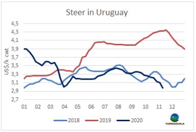 烏拉圭育成閹牛價格2017年年末以來首次達3美元/公斤的低點