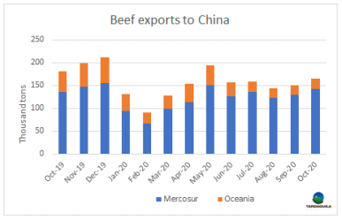 以南方共同市場為主的南美產(chǎn)品在中國進口牛肉市場的份額持續(xù)上升。10月南美地區(qū)牛肉出口量出口了14.3萬噸,估計從阿根廷進口4.5萬噸,較9月增加1.3萬噸。澳大利亞和新西蘭對中國的出貨量增加了不到1000噸,達21417噸。與去年10月相比,南方共同市場對中國出口量增長了5%(6565噸),而澳洲對中國出口量下降52%,減少了2.3萬噸。