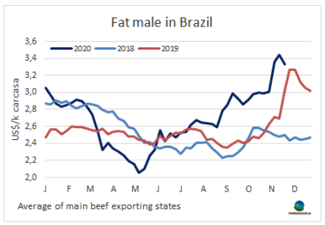 本周烏拉圭育成閹牛價(jià)格達(dá)南美地區(qū)最低,這是近十年來鮮有發(fā)生的,也是2017年四月以來第一次達(dá)本地區(qū)最低。本周烏拉圭特種出口閹牛成交價(jià)2.85美元/公斤,低于阿根廷的出口閹牛成交價(jià)2.92美元/公斤和巴拉圭的胴體成交價(jià)2.95美元/公斤。巴西牛價(jià)仍明顯高于其他地區(qū),盡管上漲的趨勢有所停頓,上周開始牛價(jià)走勢下行調(diào)整,巴西主要出口州育肥牛平均價(jià)格下降了11美分,下降至3.33美元/公斤。南方共同市場閹牛價(jià)格指數(shù)本周下降了7美分,下降至3.15美元/公斤。